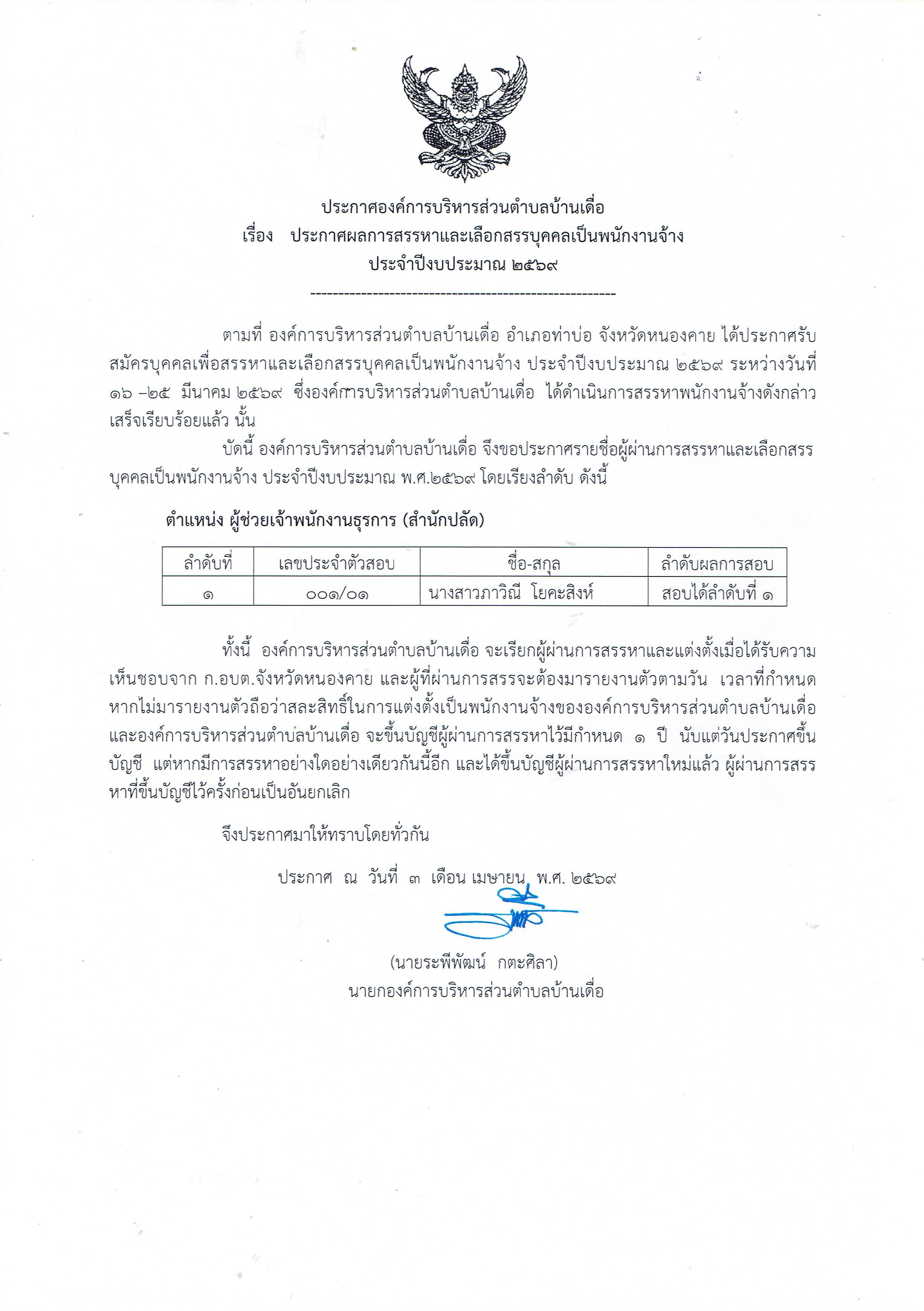 ประกาศองค์การบริหารส่วนตำบลบ้านเดื่อ เรื่อง ประกาศผลการสรรหาและเลือกสรรบุคคลเป็นพนักงานจ้าง ประจำปีงบประมาณ พ.ศ. 2569 |