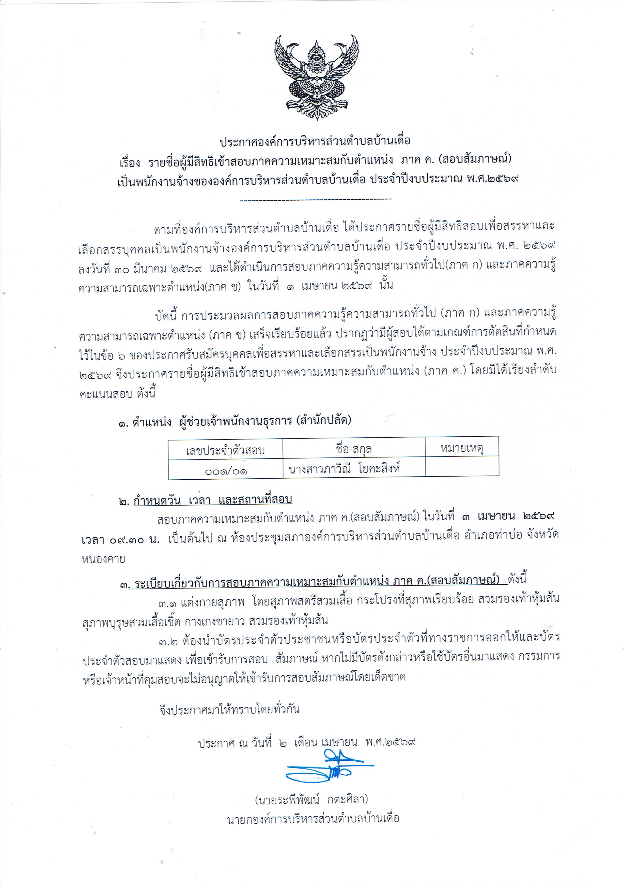 ประกาศองค์การบริหารส่วนตำบลบ้านเดื่อ เรื่อง ประกาศรายชื่อผู้มีสิทธิเข้าสอบภาคความเหมาะสมกับตำแหน่ง ภาค ค. (สอบสัมภาษณ์) เป็นพนักงานจ้างขององค์การบริหารส่วนตำบลบ้านเดื่อ ประจำปีงบประมาณ พ.ศ. 2569